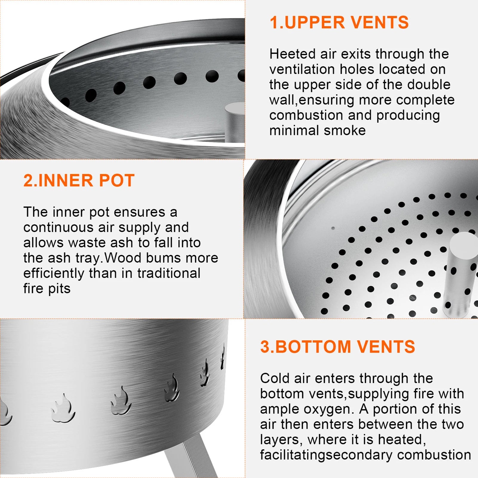 LESS , MORE FLAME: The camping stove features our Signature 360° Airflow and double wall design with bottom vent holes for oxygen to feed the fire from below, creating a burst of hot air over the fire and reducing without the use of batteries and fans in your fireplaces. Enjoy a fire without the post-fire smell in your hair and clothes.
